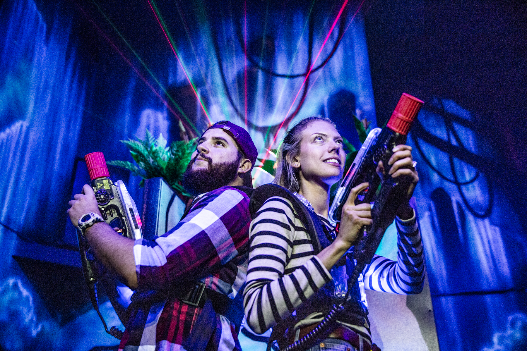 Our 3,800 square foot two level arena is designed for maximum fun! You’ll have plenty of obstacles to hide behind our futuristic industrialized untamed rainforest of twisted trees.